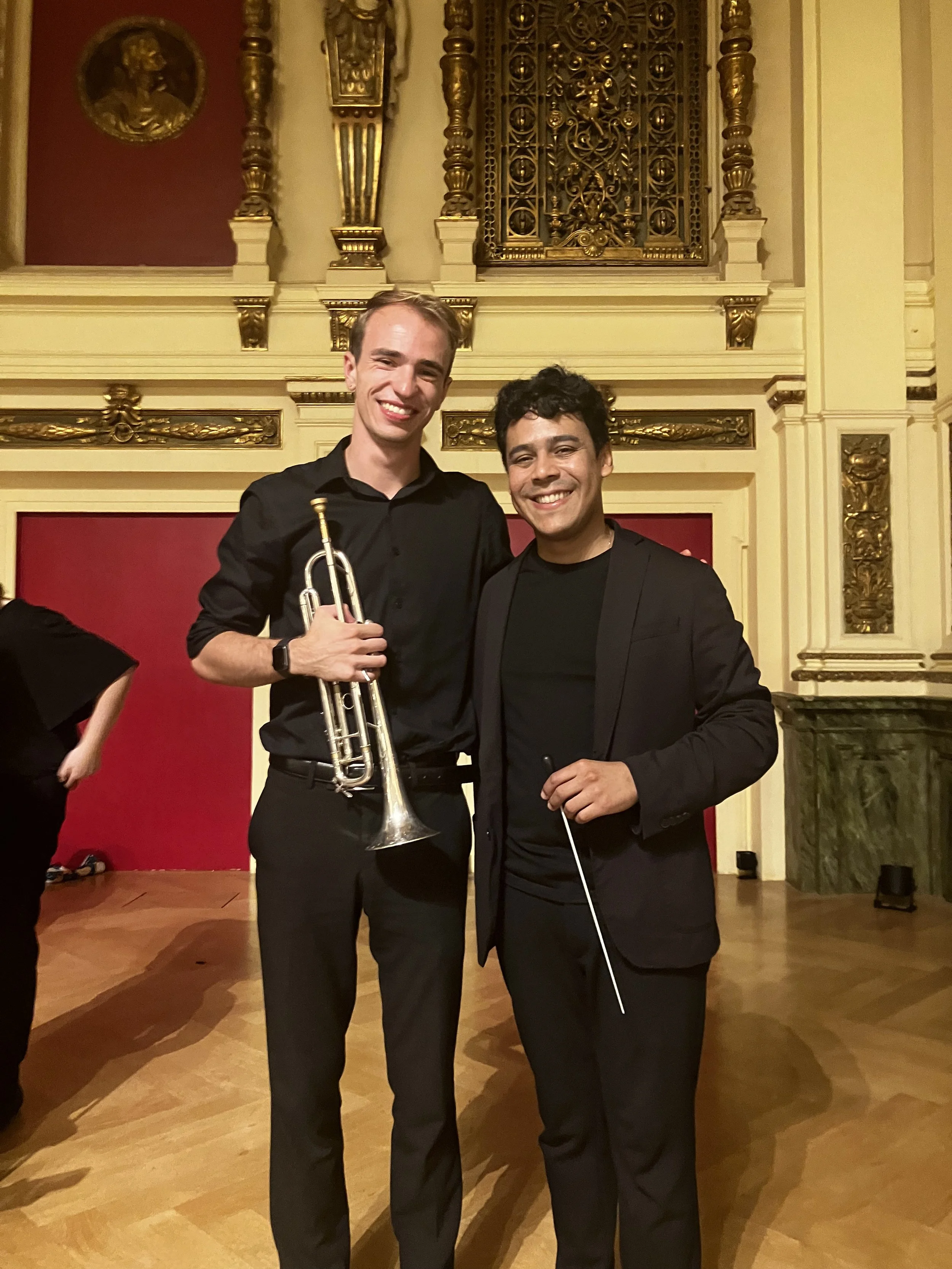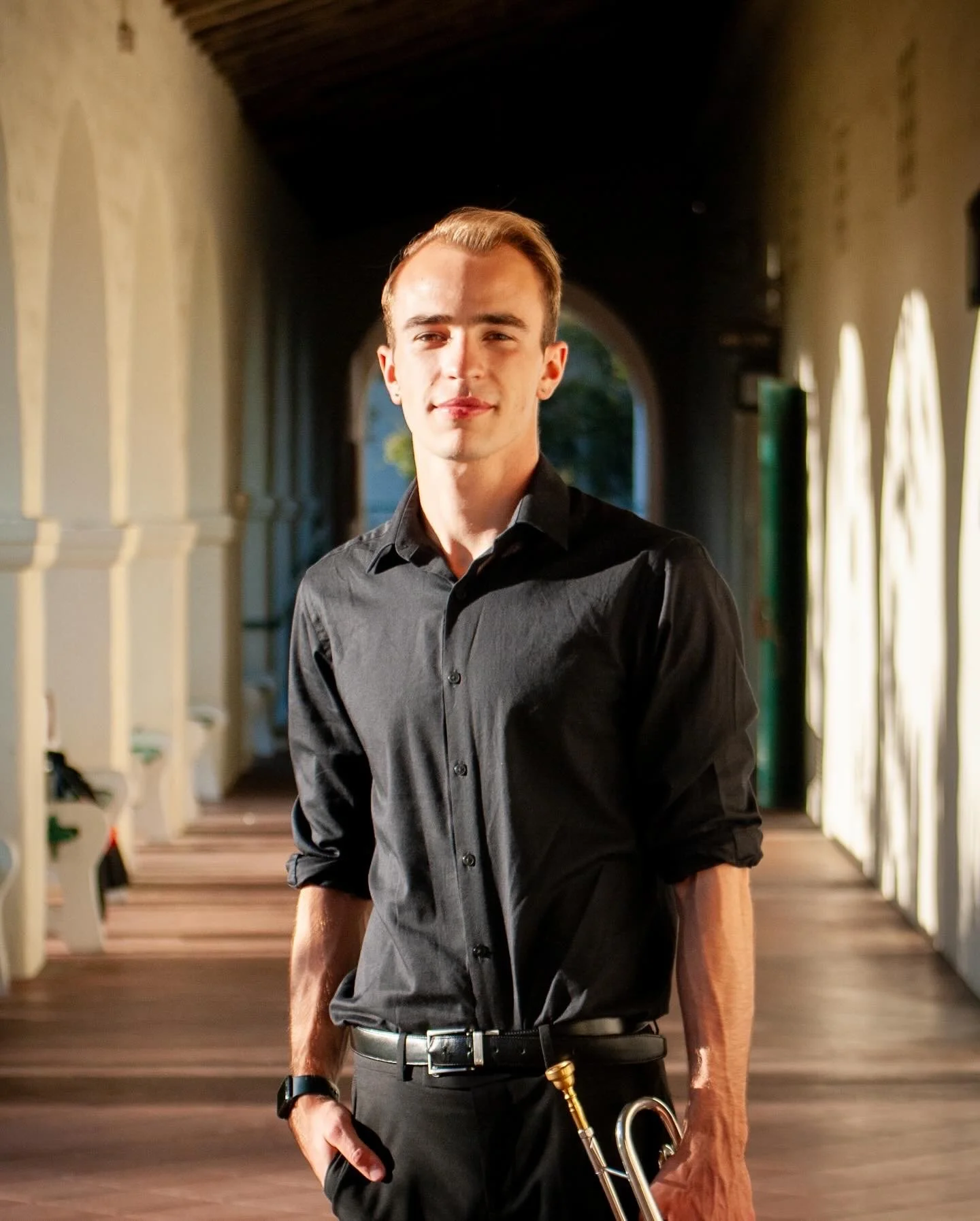 Adam started his musical journey in the fourth grade playing the clarinet as a tribute to his father. After seeing the 2017 DCI World Championships, he knew that he needed to switch to the trumpet and did so in his junior year of high school. He was a drum major and visual instructor at his high school in Colorado, and had an extreme passion for the marching arts before falling in love with orchestral music in college. He also held an internship at Castle Rock Middle School, teaching and conducting the bands there in his senior year. His first time playing trumpet as a primary instrument was 2021 in the SDSU ensembles, although he appeared on many occasions as a bass, contrabass, and contra-alto bass clarinetist in his first several years before transitioning entirely. After some more time on the trumpet and a deep focus on trumpet pedagogy and repertoire, he was able to secure positions in the SDSU orchestras and Wind Symphony in his fourth semester.